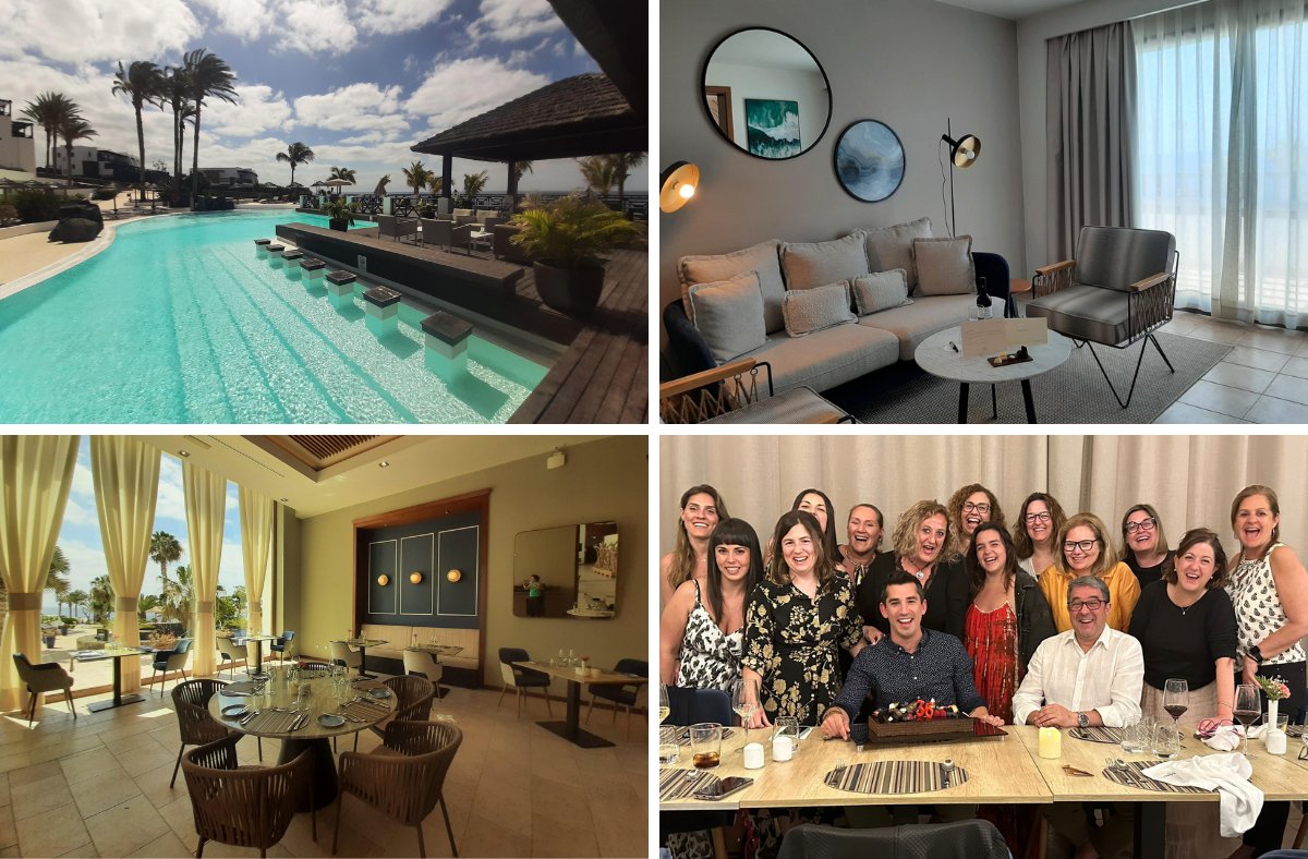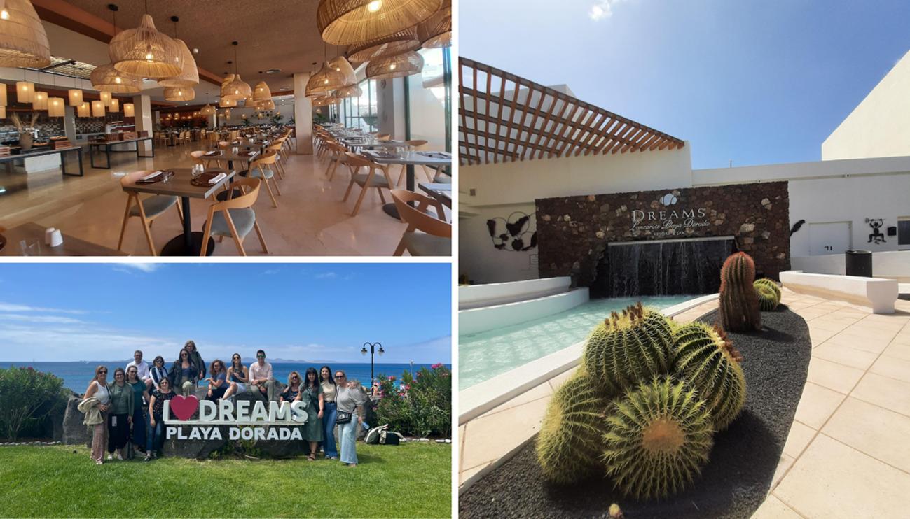 Una vez en Lanzarote visitamos el Dreams Lanzarote Playa Dorada, situado en la zona sur de la isla. El hotel está segmentado por zonas: por un lado, dispone de zonas adaptadas a los niños; por otro, además de alojamiento ofrece todo tipo de servicios para los clientes Prefer: cocktails, bodas, fiestas y cenas de gala a medida. También se organizan reuniones de negocios y eventos para a empresas.